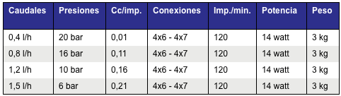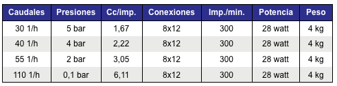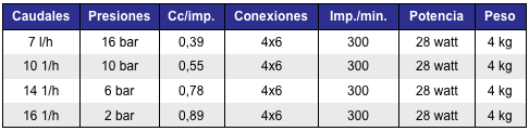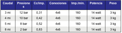 El mecanismo de estas bombas es de tipo excéntrico con platillo con retorno por un muelle y está alojado dentro de un cárter de aluminio bañado en aceite. La regulación de la bomba es manual, pero es posible gestionarla con una señal remota.